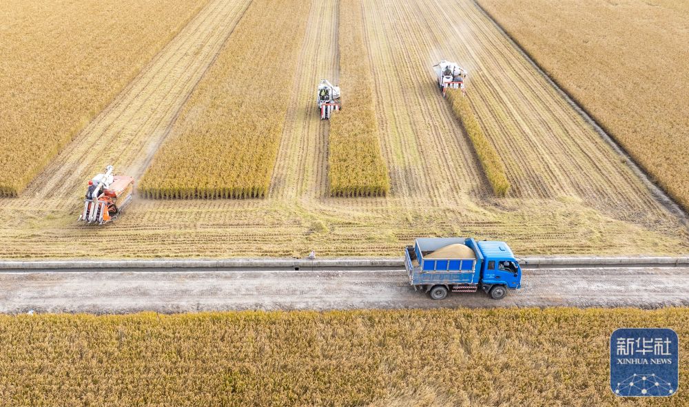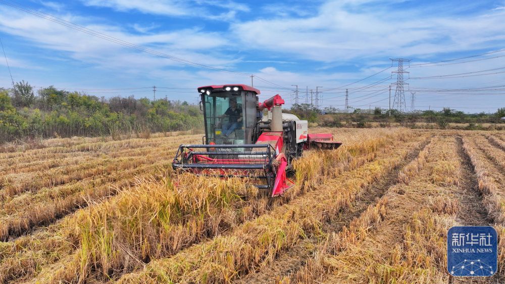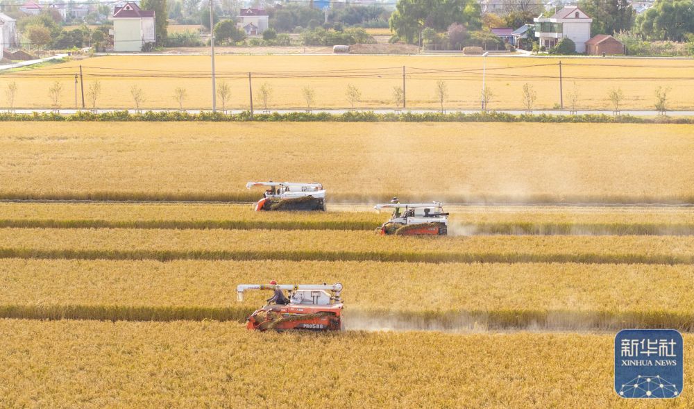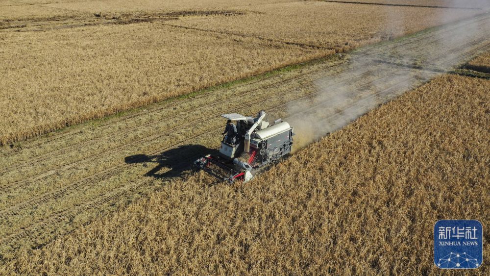 ↑ 11月3日,在安徽省合肥市蜀山区小庙镇段冲村,农机手驾驶收割机在田间收割水稻(无人机照片)。新华社发(陈三虎 摄)