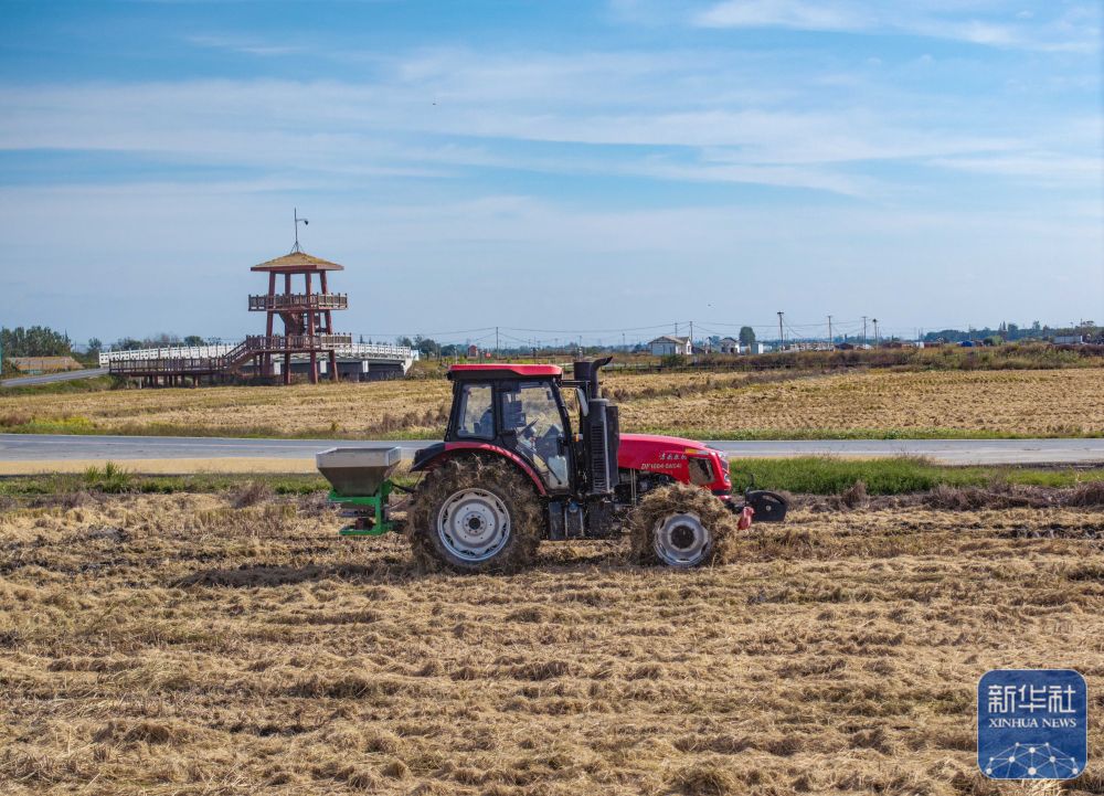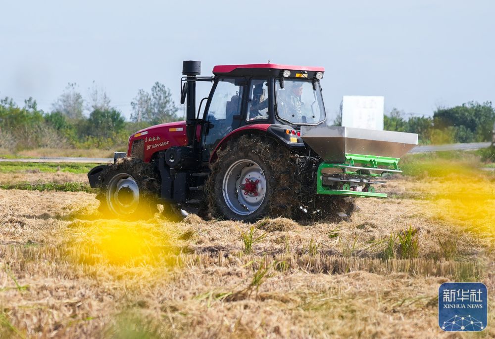 ↑ 11月3日,农民驾驶农机在江苏省兴化市兴东镇周韩村田间施肥,为冬小麦播种做准备。新华社发(周社根 摄)