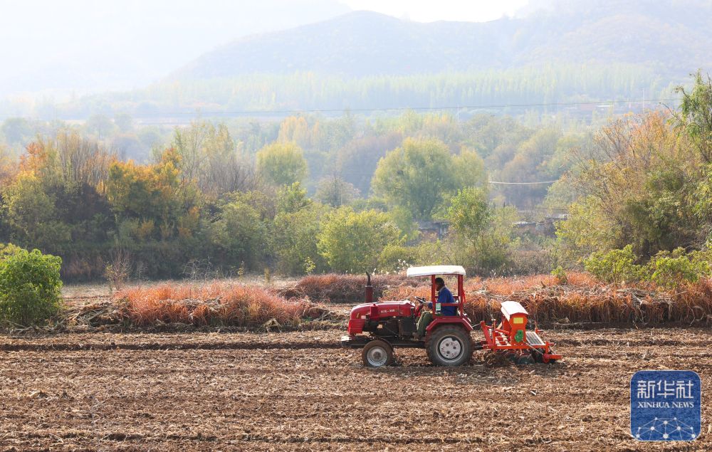 ↑ 11月3日,在河北省石家庄市井陉县威州镇东街村田地,农户驾驶农机播种冬小麦。新华社发(梁子栋 摄)