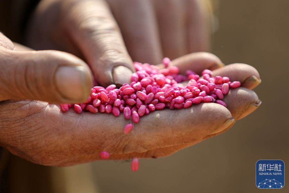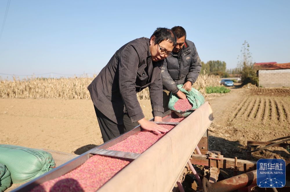 ↑ 11月3日,河南省平顶山市宝丰县大营镇赵楼村农民在查看冬小麦种子。新华社发(何五昌 摄)