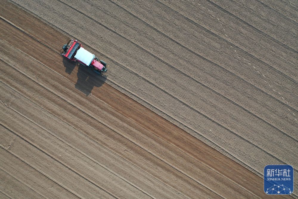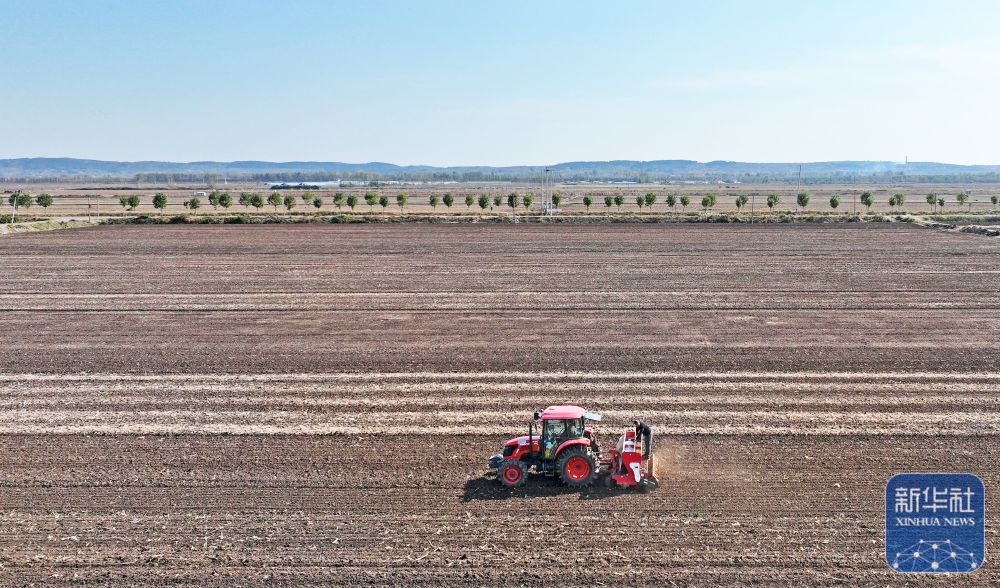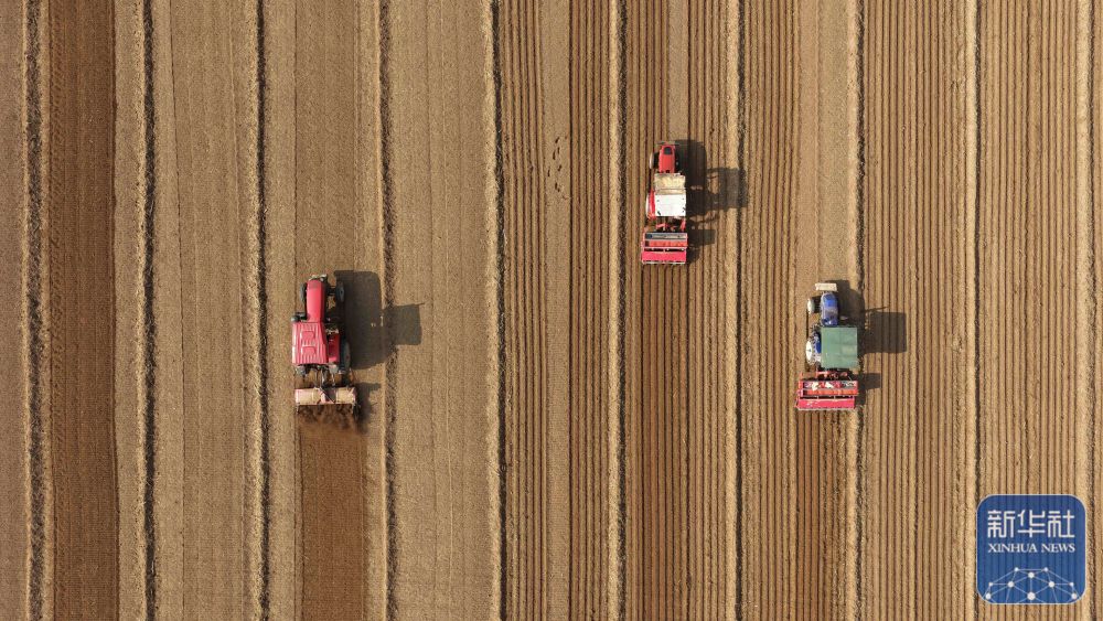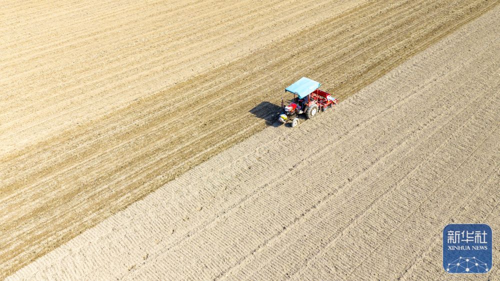↑ 11月3日,在河北省石家庄新乐市化皮镇官庄村,农民驾驶农机播种小麦(无人机照片)。新华社发(贾敏杰 摄)