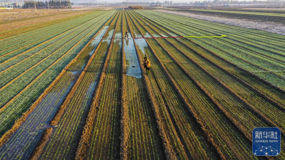 ↑ 11月3日,河北省遵化市东新庄镇农民在麦田浇水(无人机照片)。新华社发(刘满仓 摄)