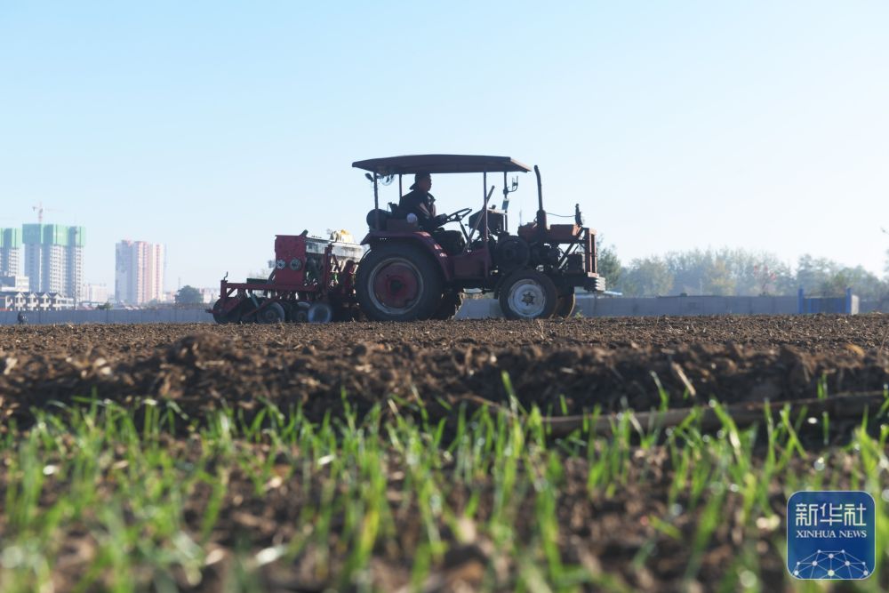 ↑ 11月1日,在河北省石家庄新乐市长寿街道办事处东名村,农民驾驶农机播种冬小麦。新华社发(贾敏杰 摄)