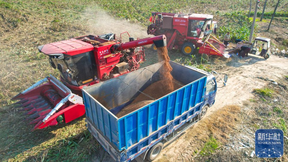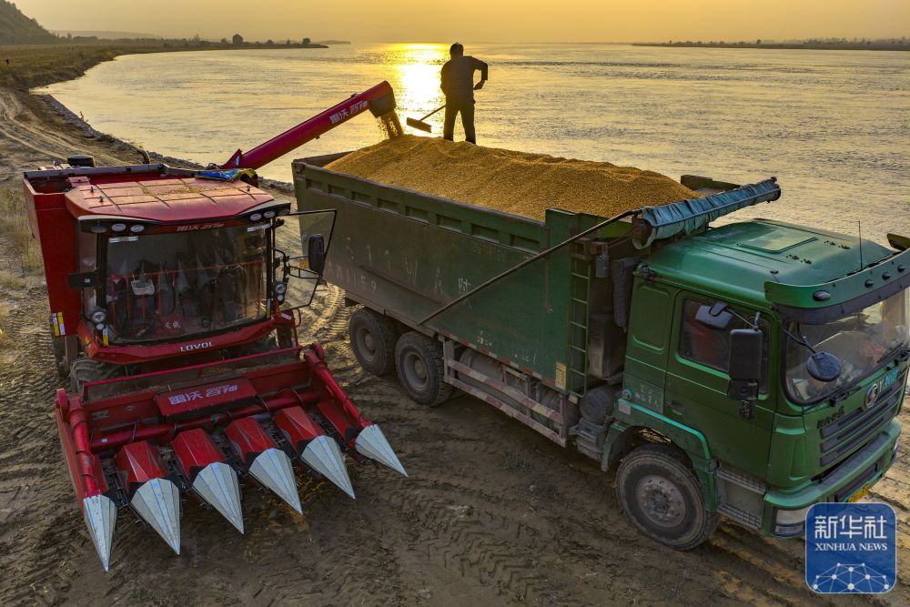 ↑ 11月2日,在河南省三门峡市灵宝西阎乡黄河岸边,收割机把抢收的玉米装车(无人机照片)。新华社发(杜杰摄)