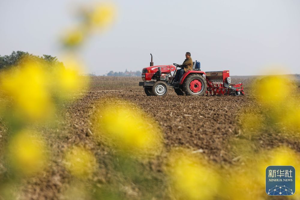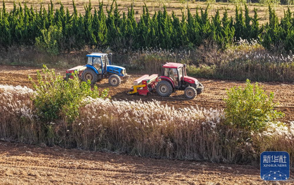 ↑ 11月3日,河南省平顶山市宝丰县大营镇赵楼村农民驾驶农机播种冬小麦。新华社发(何五昌 摄)