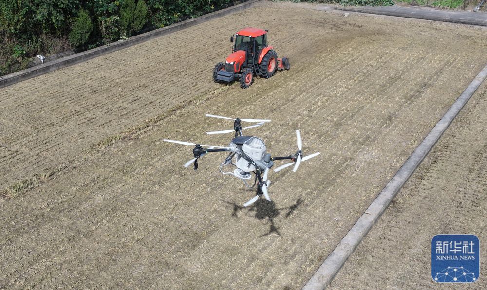 ↑ 11月3日,植保无人机在位于江苏扬州的江苏里下河地区农科所(扬州市农科院)进行播种冬小麦前的施肥作业(无人机照片)。新华社发(孟德龙 摄)