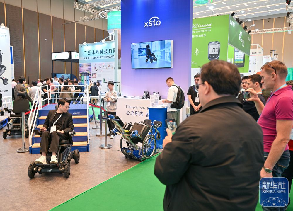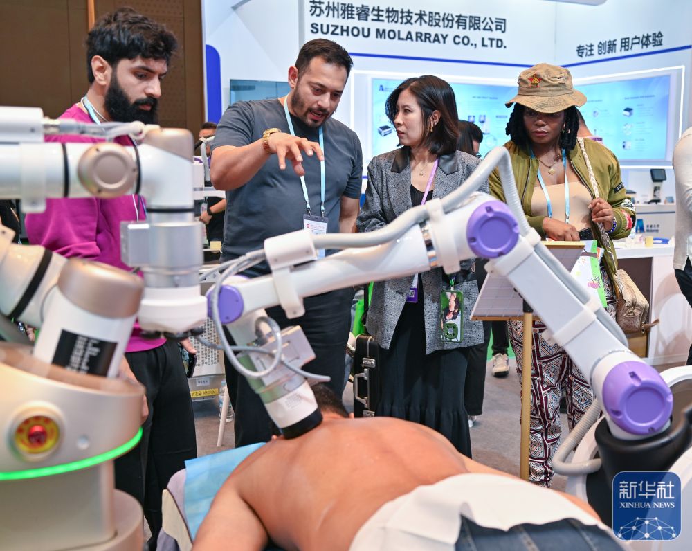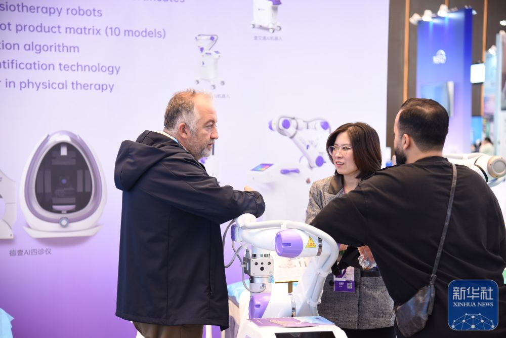 ↑ 11月3日,客商在广交会展馆了解一款理疗机器人。新华社记者 肖恩楠 摄