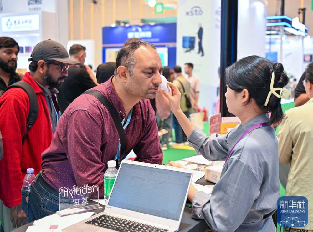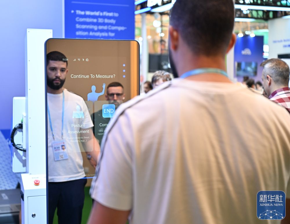 ↑ 11月3日,客商在广交会展馆体验一款智能身体测量产品。新华社记者 肖恩楠 摄
