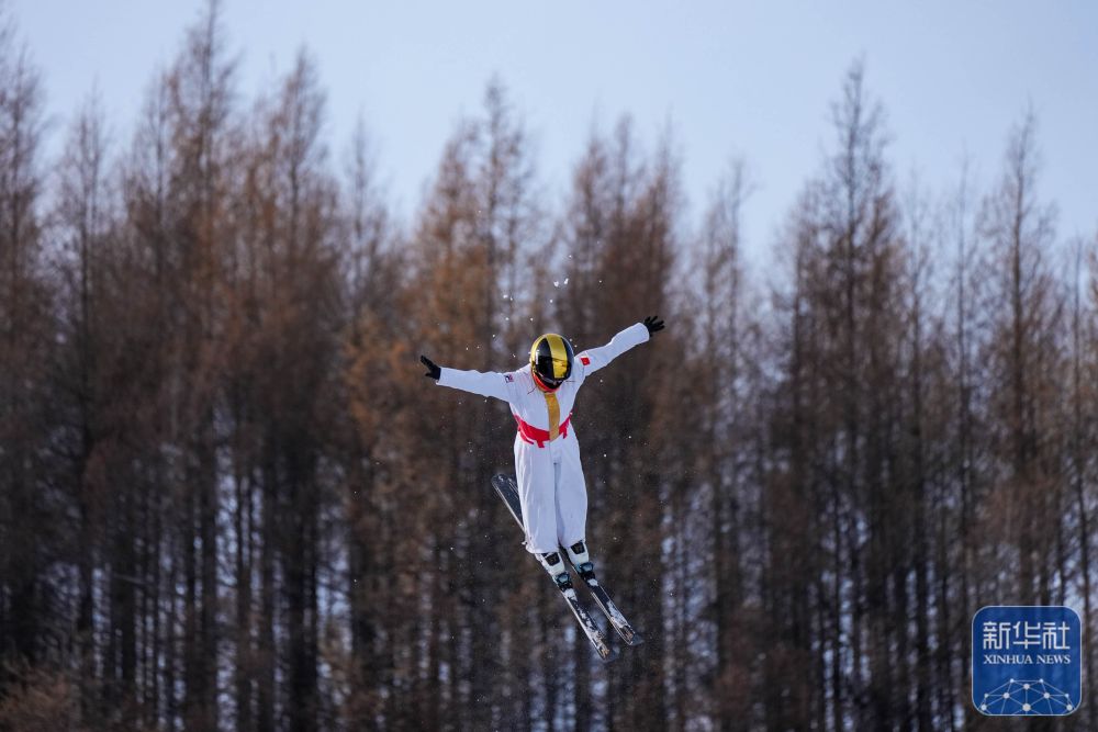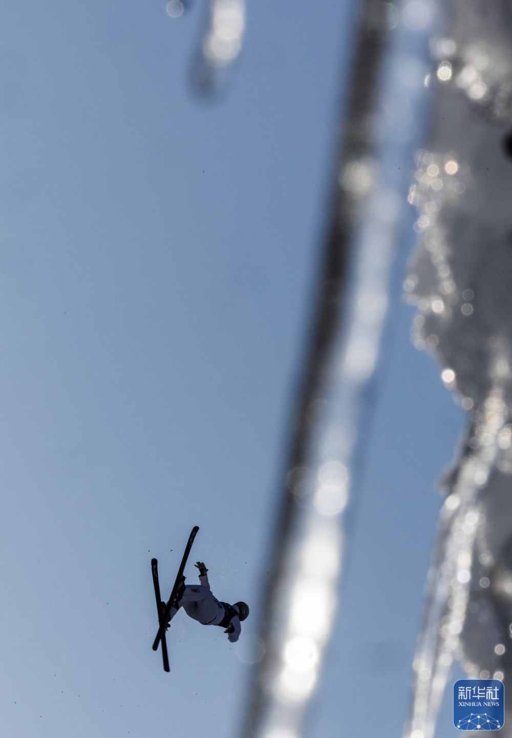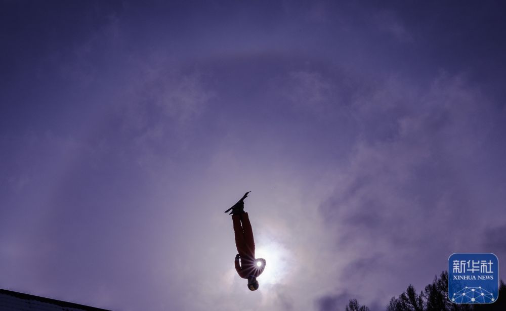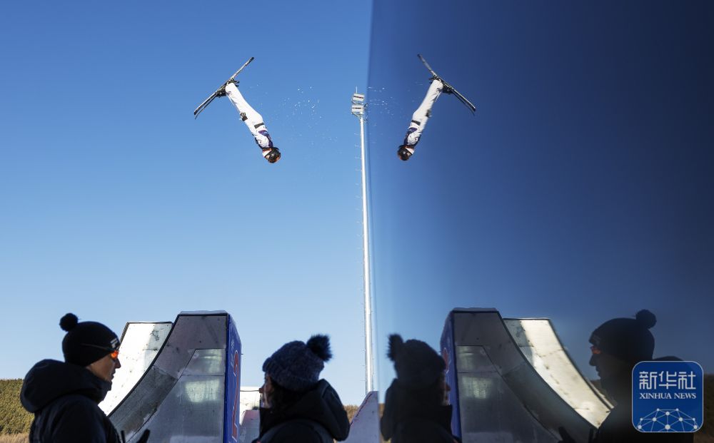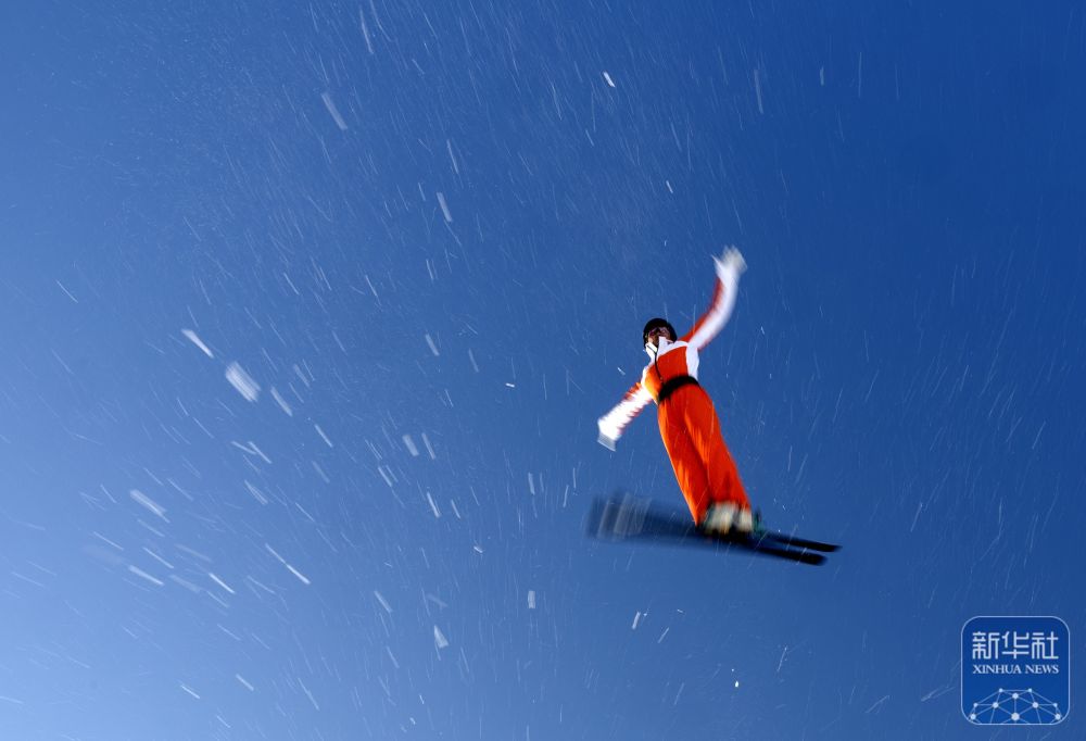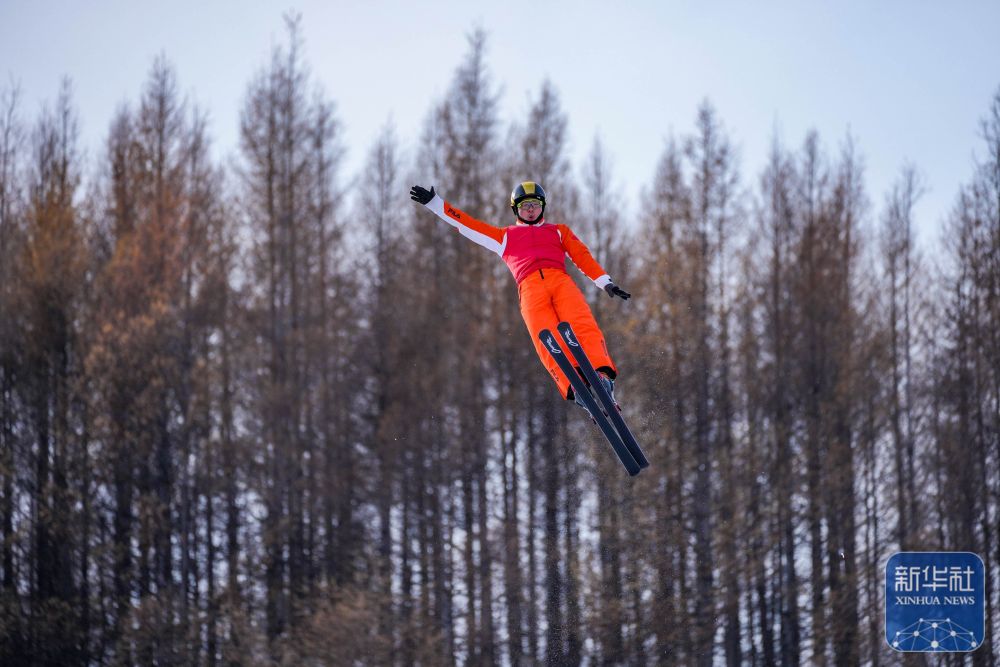 ↑ 11月7日,自由式滑雪空中技巧国家集训队队员孙佳旭在训练中试跳。 新华社记者 费茂华 摄