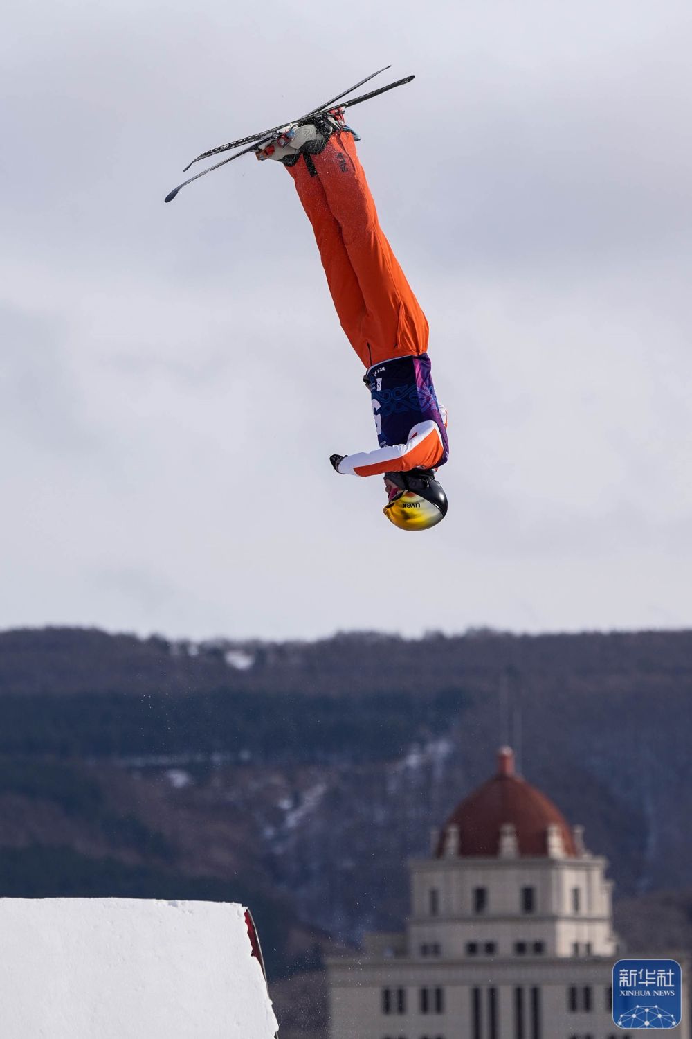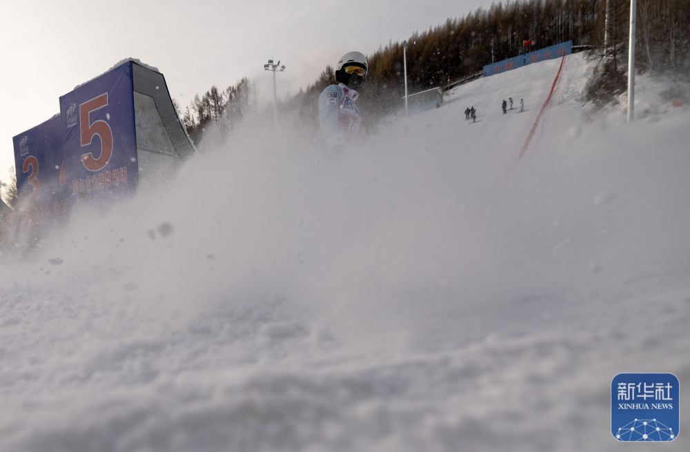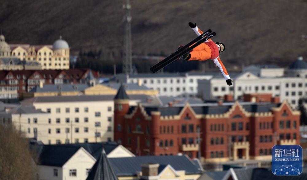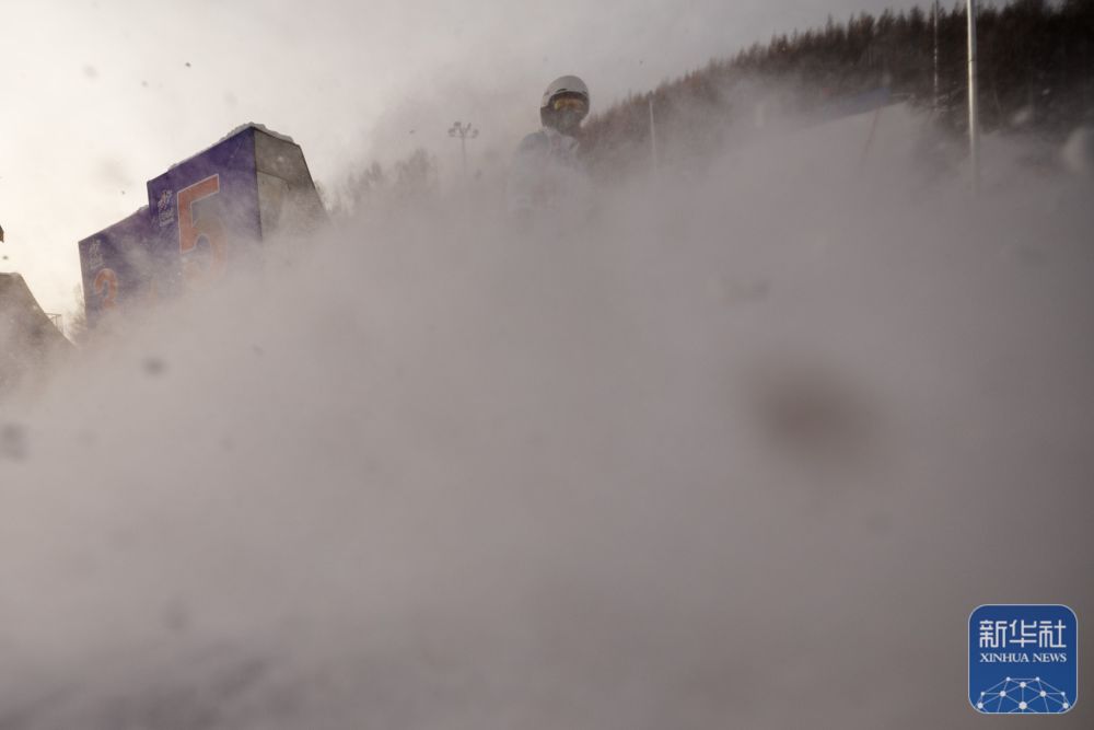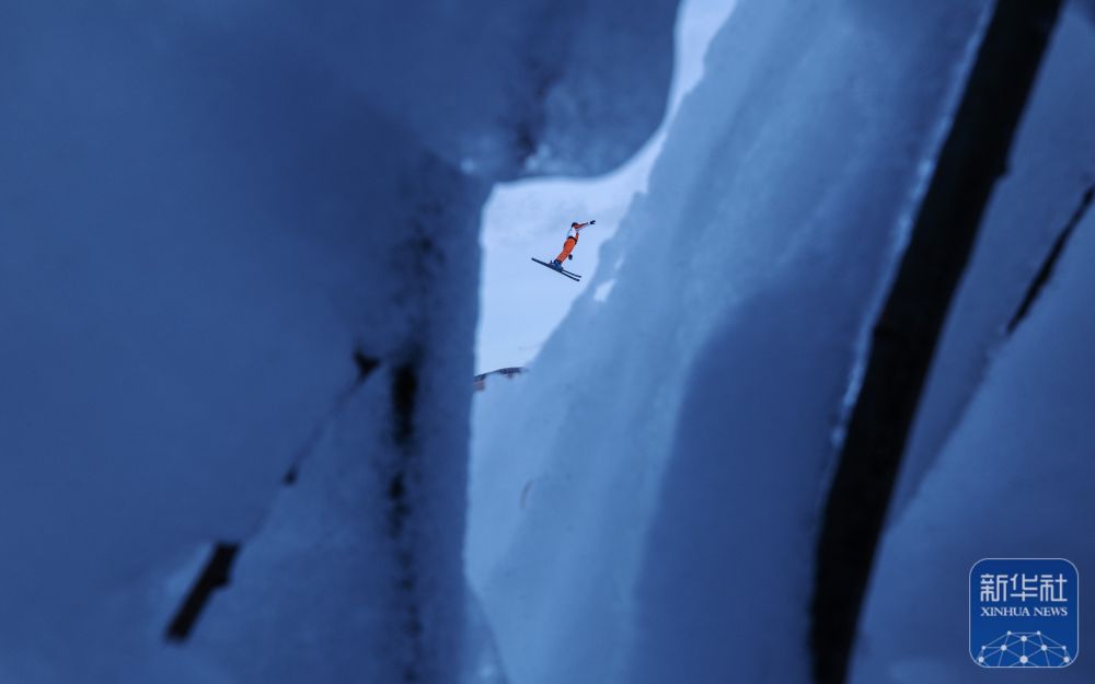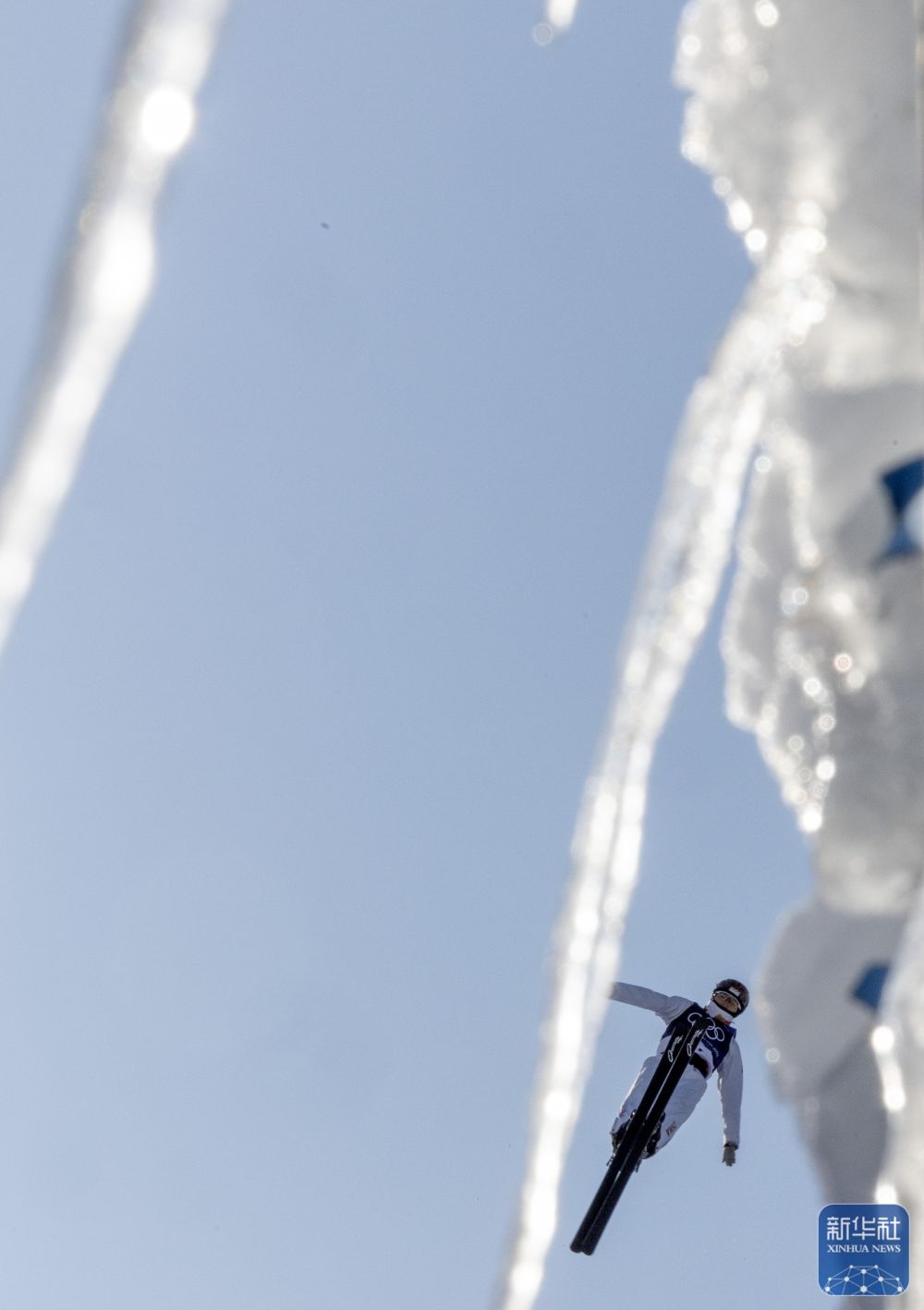 ↑ 11月7日,自由式滑雪空中技巧国家集训队队员孙佳旭在训练中试跳。 新华社记者 费茂华 摄