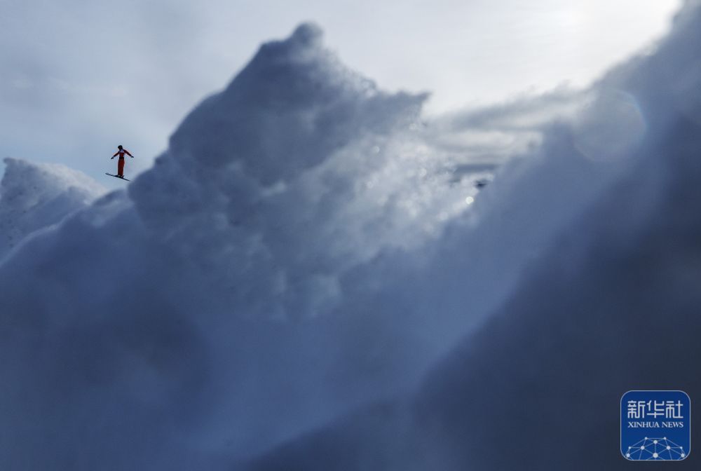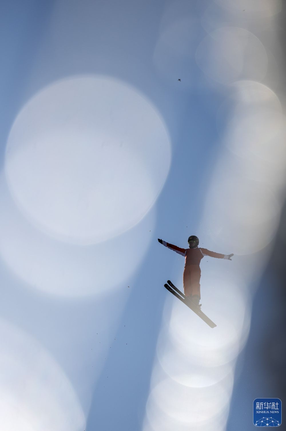 ↑ 11月6日,自由式滑雪空中技巧国家集训队队员孙佳旭在训练中试跳。 新华社记者 费茂华 摄