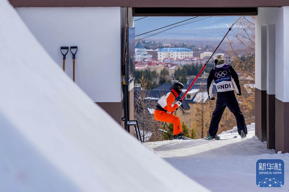 ↑ 11月7日,自由式滑雪空中技巧国家集训队队员徐梦桃(右一)在准备出发试跳。 新华社记者 费茂华 摄