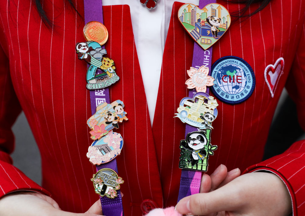 ↑ 11月10日,一名志愿者展示自己在进博会上收集到的徽章。新华社记者 王婧嫱 摄