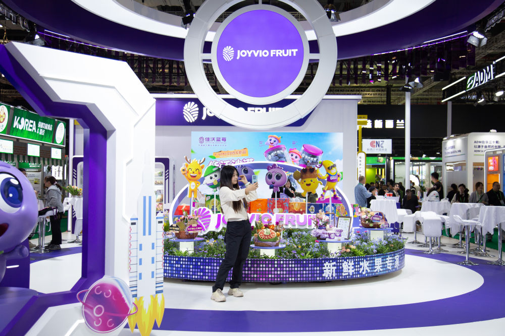 ↑ 11月10日,在农食产品展区的一个展台,一名参观者自拍留念。新华社记者 田薇薇 摄