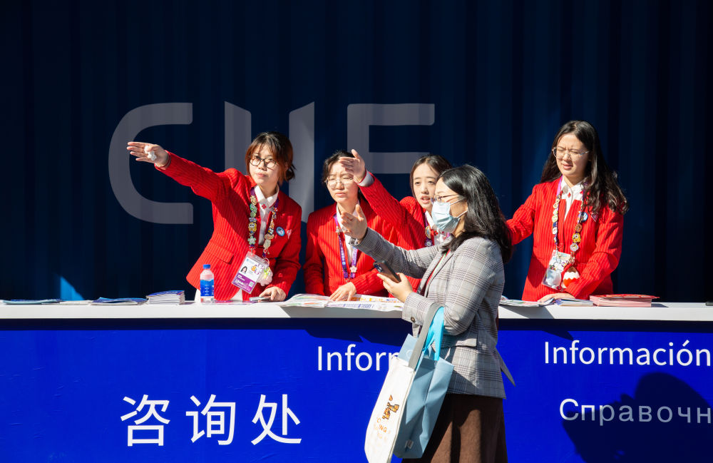 ↑ 11月10日,志愿者在国家会展中心(上海)为参观者提供服务。新华社记者 田薇薇 摄