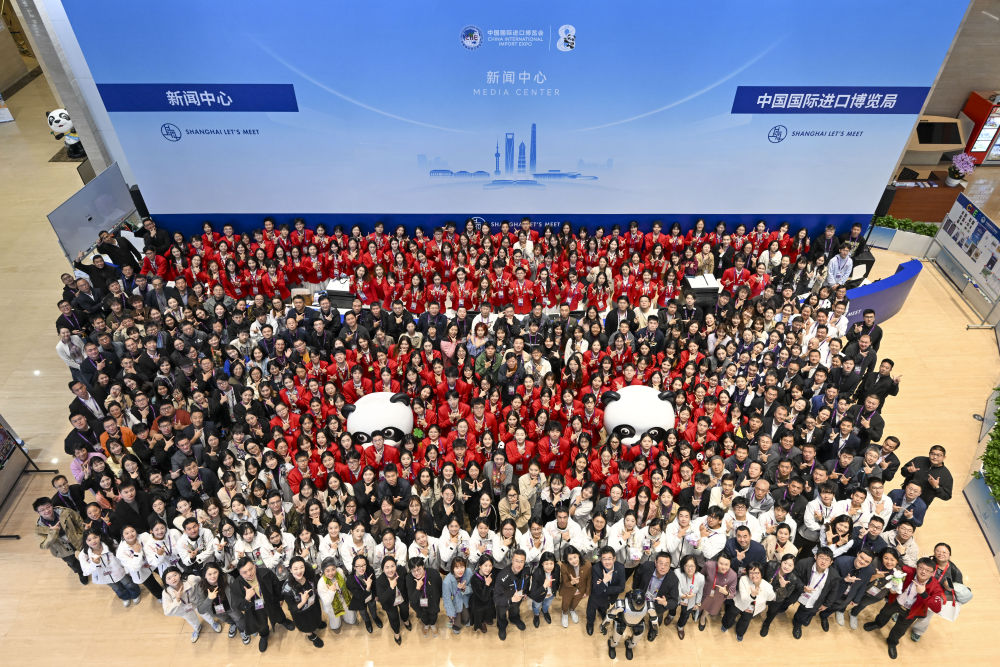 ↑ 11月10日,志愿者和工作人员在第八届进博会新闻中心合影。新华社记者 陈浩明 摄