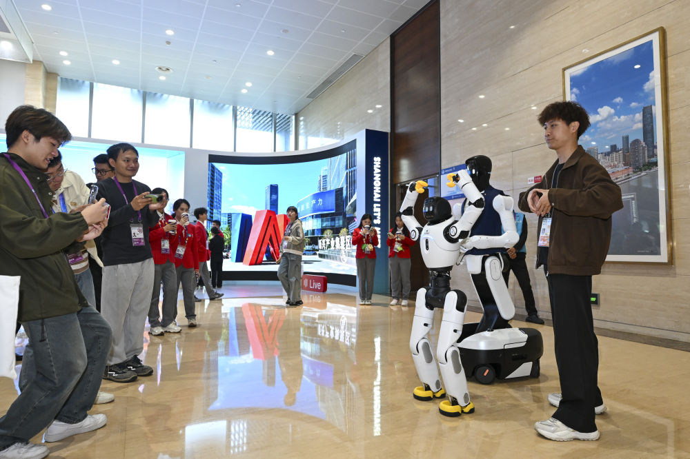 ↑ 11月10日,工作人员在第八届进博会新闻中心与机器人合影。新华社记者 陈浩明 摄