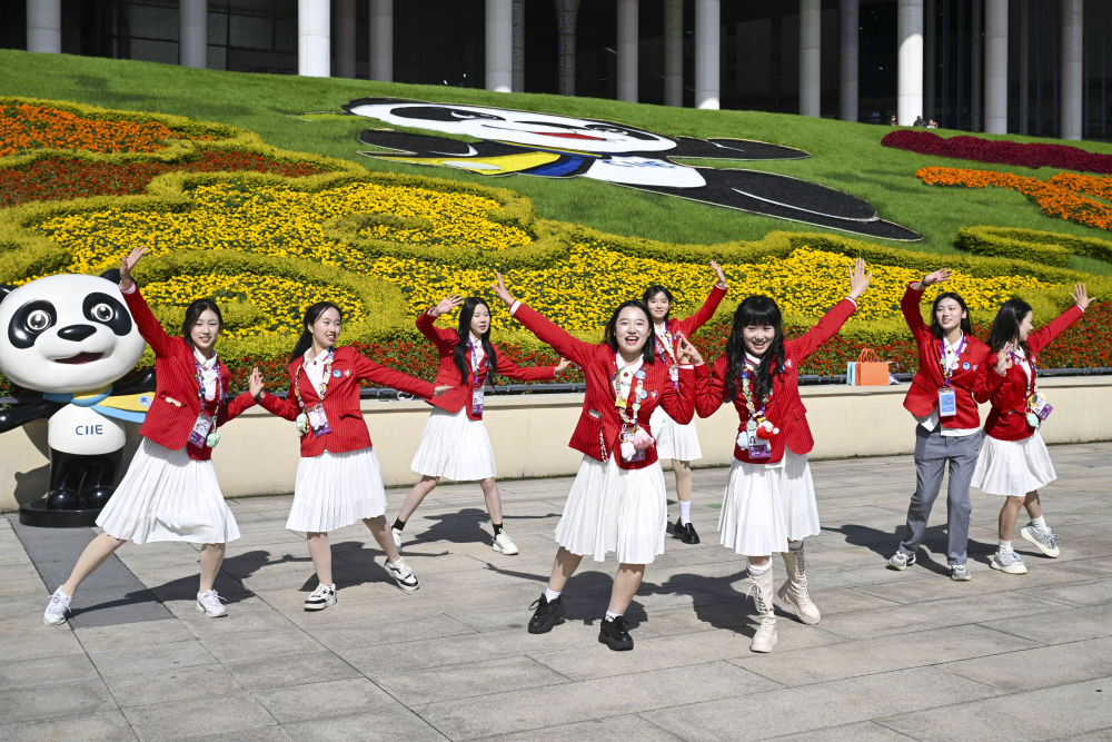 ↑ 11月10日,志愿者在第八届进博会举办地——国家会展中心(上海)南广场跳舞。新华社记者 陈浩明 摄