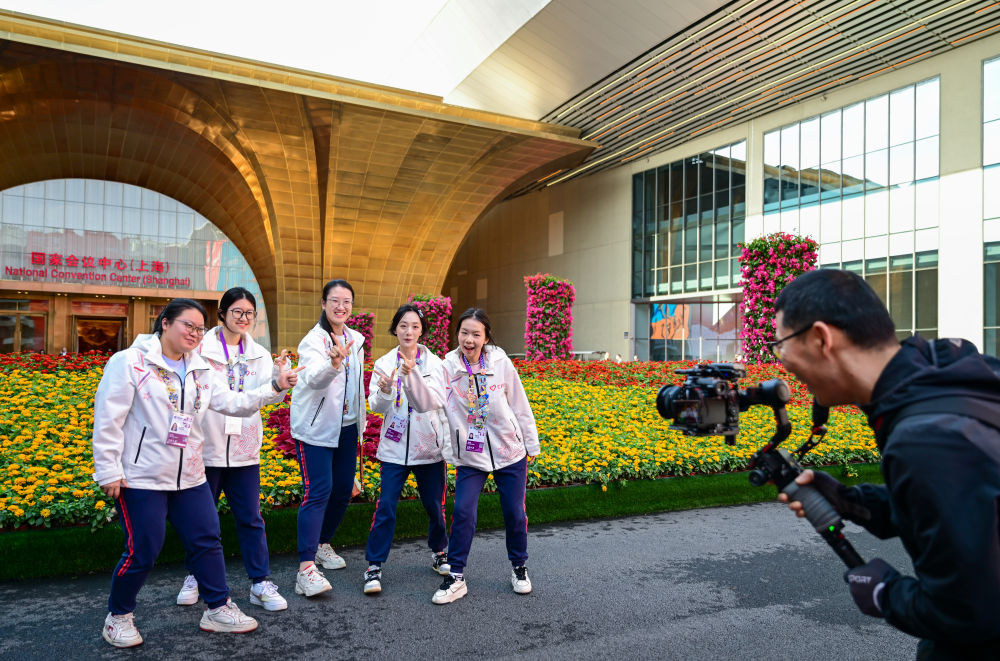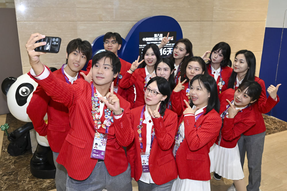 ↑ 11月10日,志愿者在第八届进博会新闻中心合影。新华社记者 陈浩明 摄