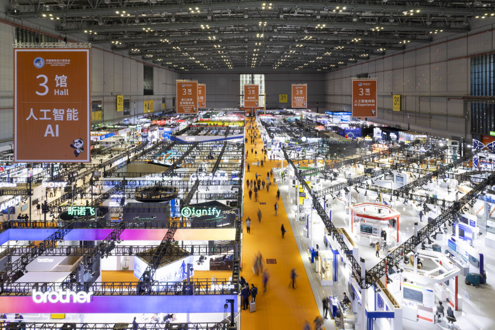 ↑ 11月10日,人们行走在国家会展中心(上海)内。新华社记者 王婧嫱 摄