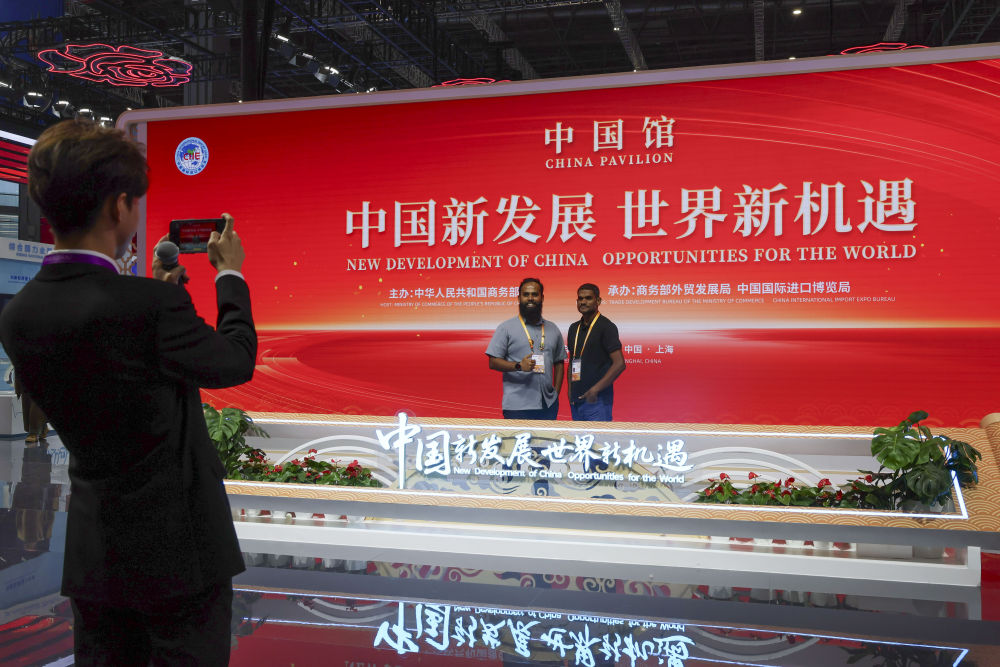↑ 11月10日,外国展商在中国馆拍照留影。新华社记者 王翔 摄