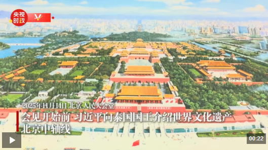 会见开始前,习近平向泰国国王介绍世界文化遗产——北京中轴线。