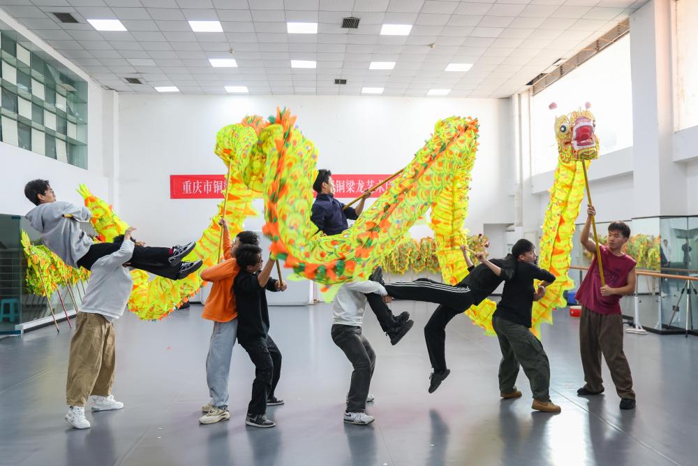 12月7日,重庆铜梁龙艺术团竞技舞龙队队员在进行日常训练。