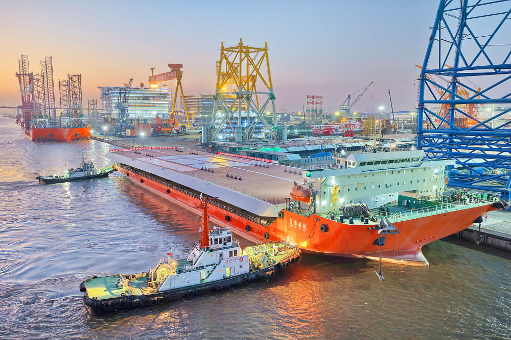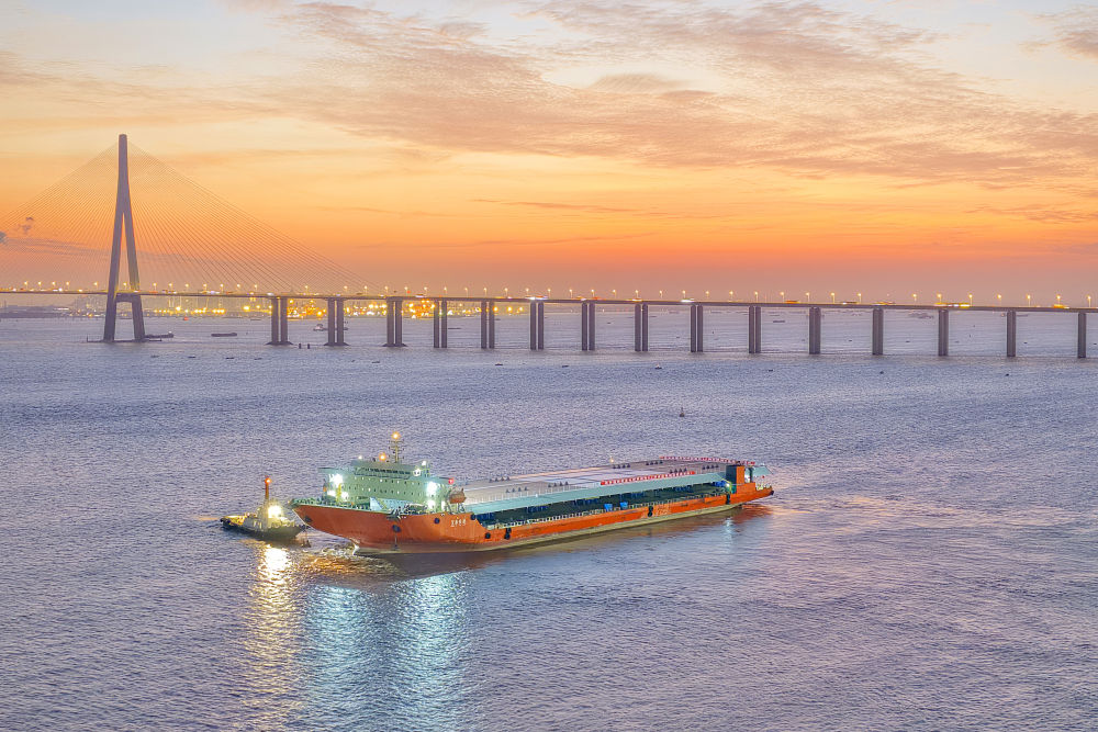 ↑ 12月9日,厦金大桥(厦门段)大节段钢箱梁在江苏南通振华重装码头发运(无人机照片)。