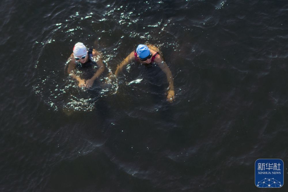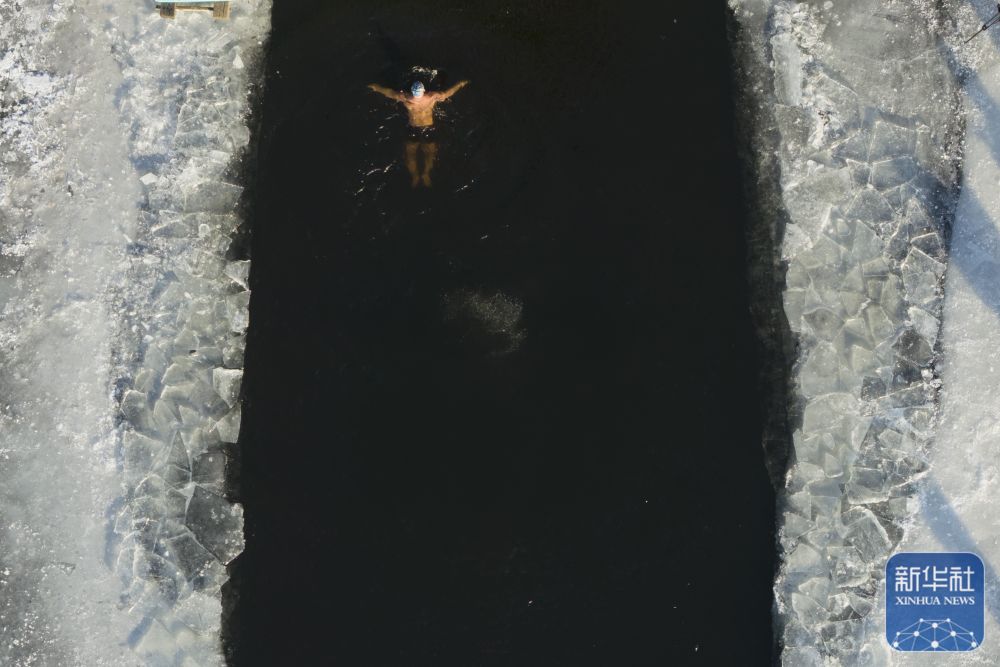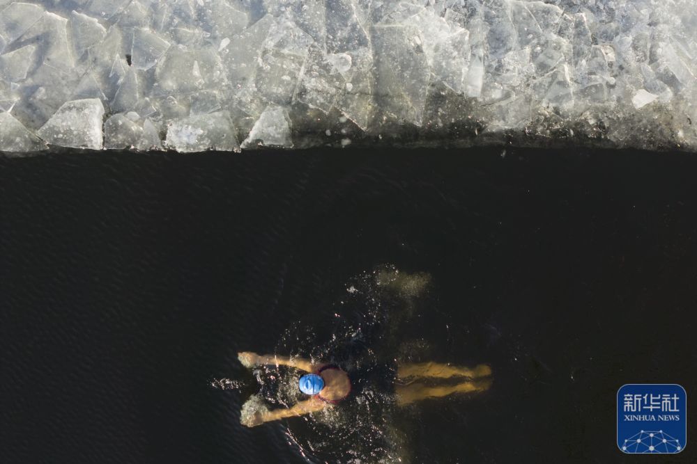 ↑ 冬泳爱好者在哈尔滨中东铁路公园冬泳场游泳(无人机照片)。