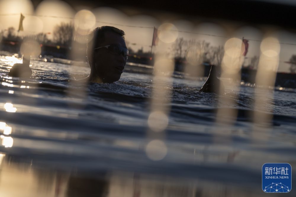 ↑ 冬泳爱好者在哈尔滨中东铁路公园冬泳场游泳。