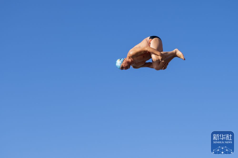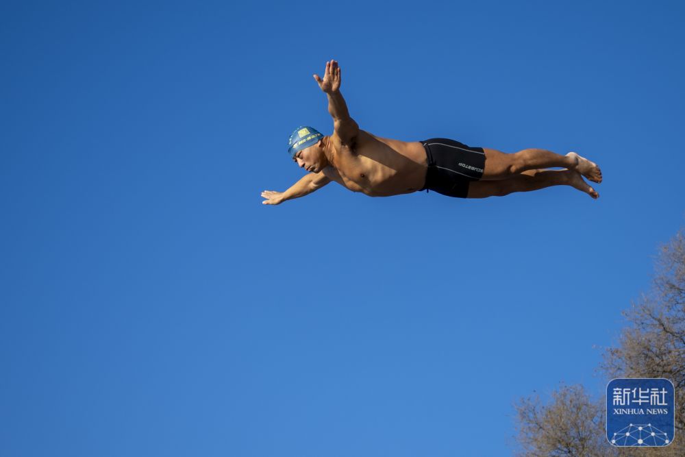 ↑ 冬泳爱好者在哈尔滨中东铁路公园冬泳场跳水。