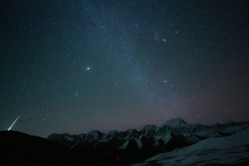 ↑12月12日,在四川省康定市甲根坝镇提弄村,一颗双子座流星从雪山上空划过。