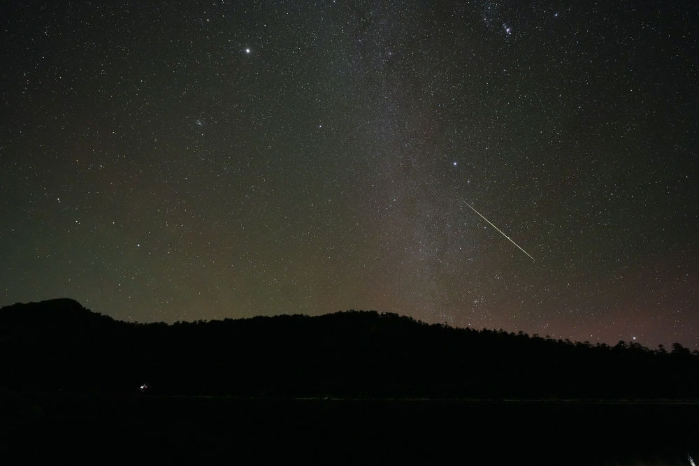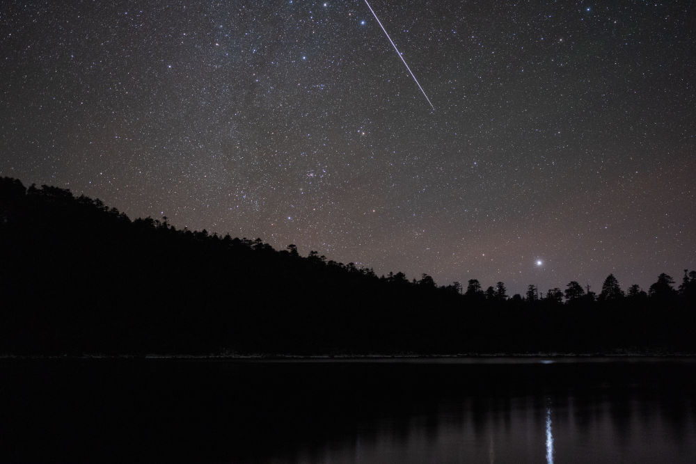 ↑12月14日,在四川省甘洛县牛角海,一颗双子座流星划过夜空。