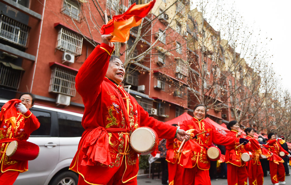 ↑ 2月6日,在河南省洛阳市涧西区武汉路街道武汉路社区“年味大集”上,文艺志愿者表演民俗节目。新华社发(黄政伟摄)