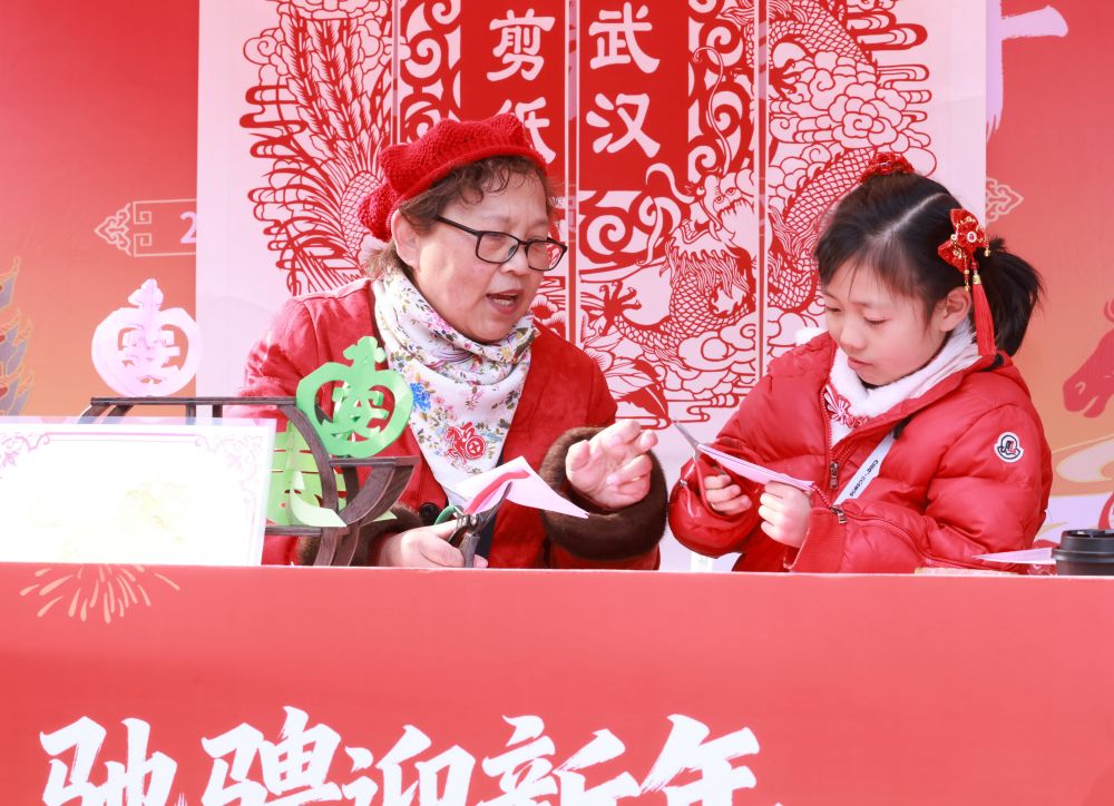 ↑ 2月7日,2026“年味武汉·非遗贺新春”系列民俗文化活动在湖北省武汉市启动。小朋友在非遗剪纸艺人指导下体验剪纸艺术。新华社发(赵军摄)