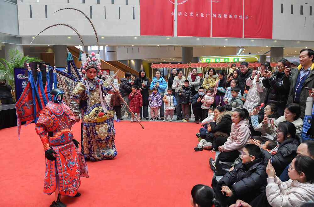 ↑ 2月7日,在浙江省金华科技馆,婺剧演员与机器人一起表演婺剧。新华社发(时宽兵摄)