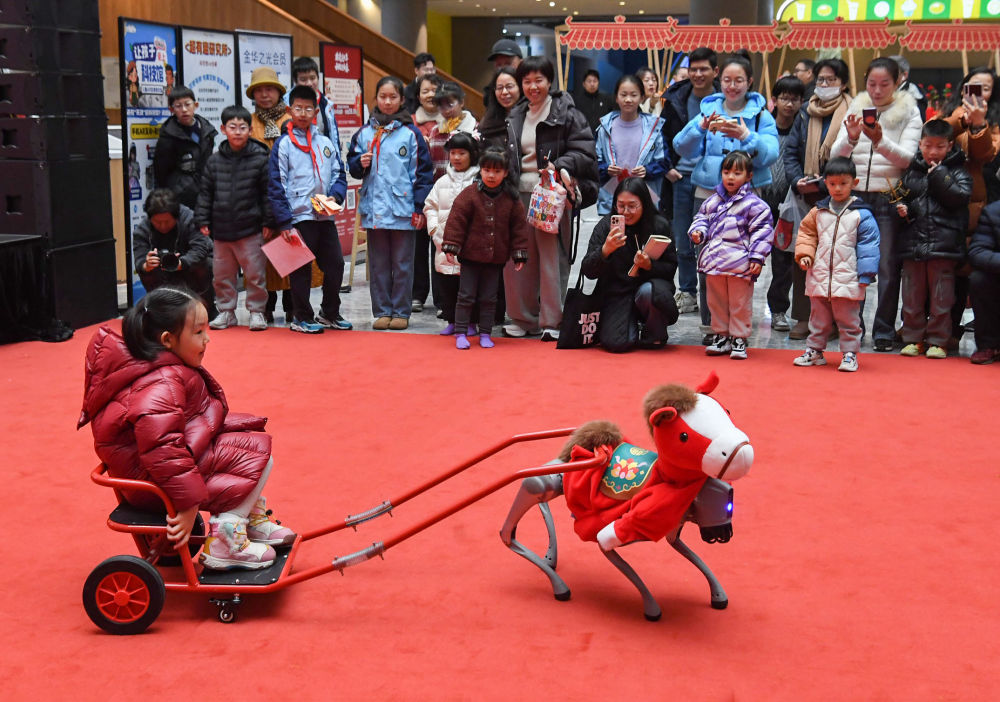 ↑ 2月7日,在浙江省金华科技馆,机器马和小朋友互动。新华社发(时宽兵摄)