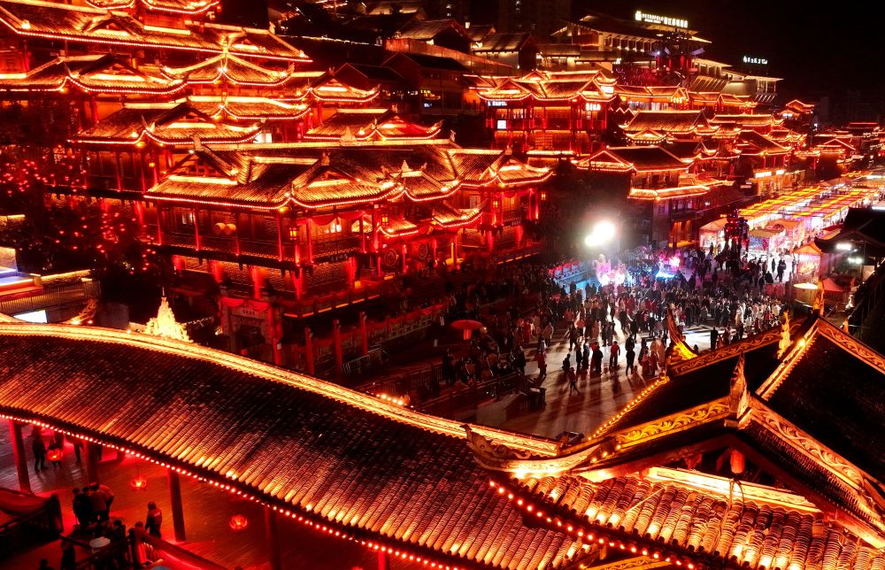↑ 2月6日,市民和游客在湖北省宣恩县贡水河畔观灯游玩赏夜景(无人机照片)。新华社发(宋文摄)