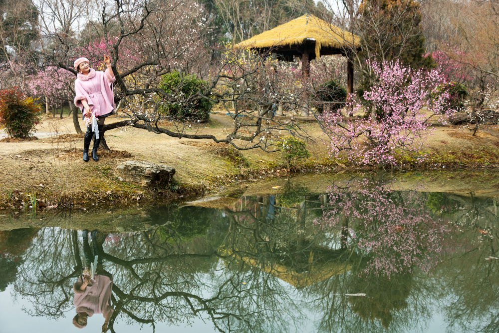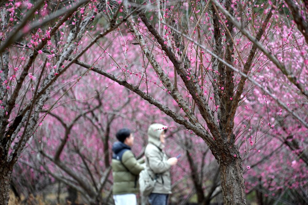 ↑ 2月5日,游人在江苏省南京市梅花山景区赏花留影。新华社发(孙忠南摄)