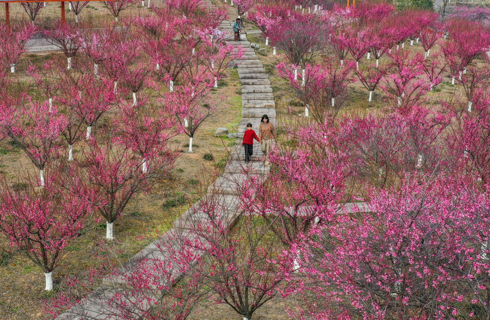 ↑ 2月4日,游人在浙江省金华市武义县花田美地景区的梅园内赏景(无人机照片)。新华社发(时宽兵摄)