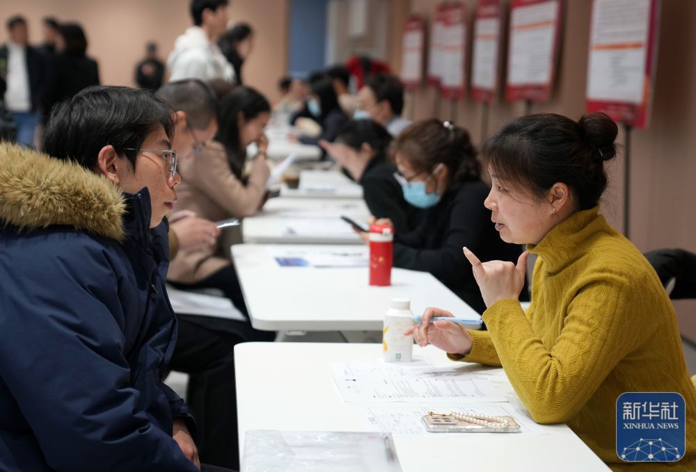 ↑ 2月25日,在浙江省杭州市举行的一场招聘会上,一家参会企业工作人员(右一)向求职者介绍岗位情况。新华社记者 韩传号 摄