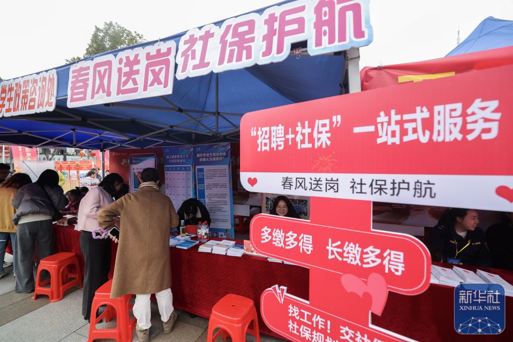 ↑ 2月25日,浙江省建德市新春人才招聘会上,应聘者在一站式服务专区咨询。新华社记者 徐昱 摄