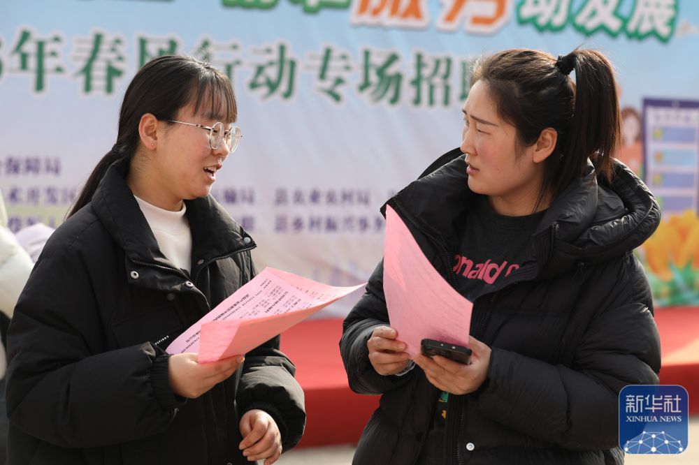 ↑ 2月24日,求职者(右)在河南省焦作市温县“春风行动”专场招聘会现场了解招聘信息。新华社发(徐宏星摄)