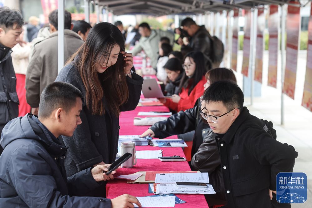 ↑ 2月25日,求职者在浙江省建德市新春人才招聘会现场咨询应聘。新华社记者 徐昱 摄