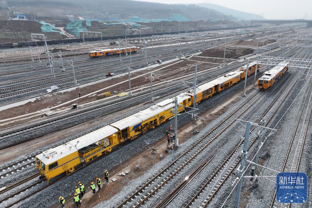↑ 2月26日,大型养路机械在西安东站站场线路上作业(无人机照片)。