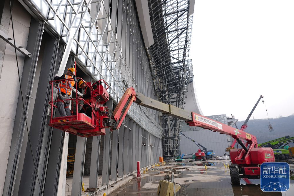 ↑ 2月26日,工人对西安东站外立面进行幕墙安装作业。