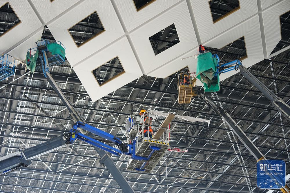 ↑ 2月26日,工人在西安东站候车大厅内部进行吊顶安装。