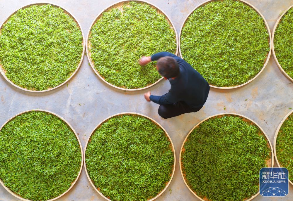 ↑ 3月13日,在湖南省衡阳市衡南县宝盖镇,宝盖幸福有机茶场的工作人员在摊晒春茶(无人机照片)。新华社发(曹正平 摄)