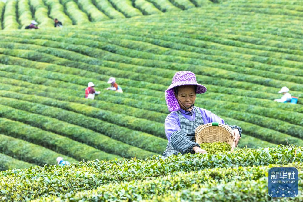 ↑ 3月13日,湖南省衡阳市衡南县宝盖镇村民在宝盖幸福有机茶场采摘春茶。新华社发(曹正平 摄)