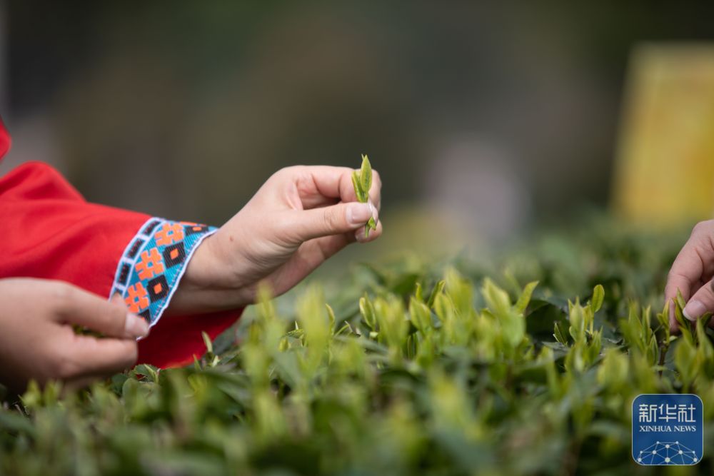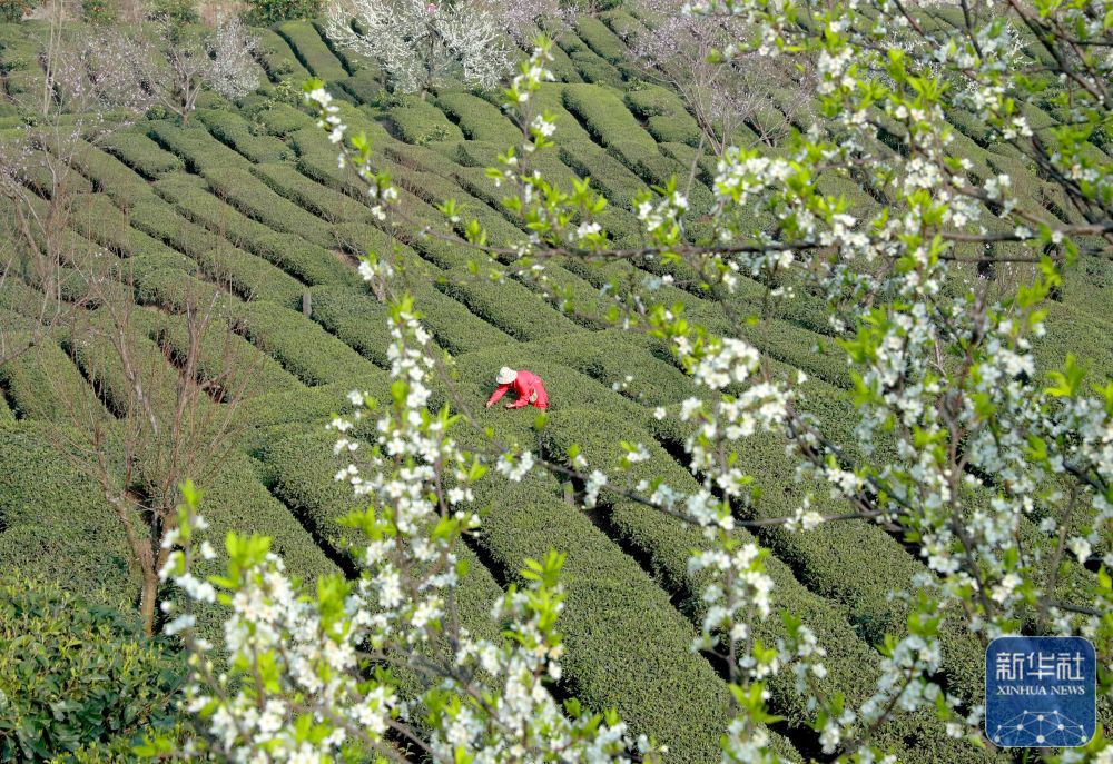 ↑ 3月13日,茶农在贵州省安顺市西秀区双堡镇银山茶场采摘春茶。新华社发(陈熙 摄)